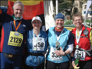 Am nächsten Morgen ging es um 6 Uhr mit dem Bus zum Start. Es war bitterkalt, windig und sehr stark bewölkt. Doch man versicherte uns, dass der Himmel aufreißen würde und sogar die Sonne scheinen sollte. Doch zunächst waren wir damit beschäftigt, uns warmzuhalten, die anderen Marathonis „zu begutachten“, die Dixis zu erkunden und auf den Startschuss zu warten. Um 8 Uhr ging es dann endlich los und wir konnten uns „warmlaufen“. Zunächst ging es stetig bergab und kaum waren wir aus Mdina rausgelaufen, war keine Menschenseele mehr zu sehen. Außer an den Kreuzungspunkten, dort standen meist zwei Schüler, die uns mit winzigen Fähnchen den rechten Weg wiesen. Wir hatten einen wunderbaren Blick auf Mdina und liefen in mehreren verwirrenden Schleifen am Nationalen Fußballstadion, an der amerikanischen Botschaft und einem Farmermarkt vorbei. Langsam zeigte sich auch tatsächlich die Sonne am Himmel und es wurde angenehm warm. Die Straßenverhältnisse waren teilweise recht bescheiden. Eine Teilstrecke stand vollkommen unter Wasser. Um keine nassen Füße zu bekommen, sind wir eine kleine Mauer hochgestiegen und dort weiter gelaufen. Als wir bei Kilometer 25 wieder an diese Stelle kamen, fiel es mir schon wesentlich schwerer, die Mauer zu erklimmen. Auch war die Strecke mit einigen Steigungen versehen, die einiges an Kraft kosteten. Christel hatte sich irgendwann von uns verabschiedet und lief ihr eigenes Tempo.Angi blieb treu an meiner Seite und versuchte mir immer wieder Mut zu machen. Es wurde zusehends wärmer, eine angekündigte Getränkestation war einfach nicht da (oder hatten wir uns verlaufen?) und es ging immer wieder bergauf… Die letzten vier Kilometer waren die schlimmsten für mich. Ich war einfach nur platt und hatte kein Bock mehr. Mir war warm und mein „Zeitziel“ von 4:59:59 h war in weite Ferne gerückt. Doch Angi schob mich immer wieder an und blieb unerbittlich an meiner Seite bzw. lief vor mir, um mich zu ziehen. Dann endlich, nach „Lichtjahren“ war endlich das Ziel zu sehen. Karl stand schon mit dem Fotoapparat bereit, ich versuchte noch ein Lächeln hinzubekommen und dann war ich auch schon über die Ziellinie gelaufen! Endlich! Geschafft!!! Gerne nahm ich meine Medaille entgegen und natürlich auch die kühlen Getränke. Nach ein paar ruhigen Minuten im Schatten auf dem Bordstein und ein paar Fotos, ging es auch schon wieder Richtung Bus, der uns ins Hotel brachte. Dort stand erstmal Erholung in Form einer ausgiebigen Dusche und eines ausgedehnten Mittags-schlafes auf dem Programm. Bei der internen Siegerehrung gab es auch eine Verlosung, bei der Karl diesmal das Glück hold war. Fünf Tage auf der Nachbarinsel Gozo im Grand Hotel – ohne Marathon – auch nicht zu verachten! Abends ging es noch zur offiziellen Siegerehrung bei Land Rover, aber leider gab es dort keine Verlosung, denn gerne wären wir in Angis neuem Auto nach Hause gefahren…