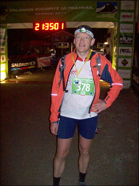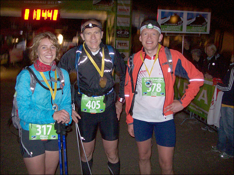 Für die restlichen 5.3 Km brauchte ich fast eine Stunde. Die Bergabpassage nach Grainau, die uns jetzt bevorstand überbot alles vorherige. Es hatte angefangen zu nieseln, der Boden war sehr rutschig. Steinige Schotterpassagen und glatter Boden wechselten auf ellenlangen Kehren ab. Endlich war der letzte Streckenposten der Bergwacht im Schein eines Lagerfeuers erreicht. Ein letztes Mal wurde meine Startnummer notiert; 349 und dann ging es auf den lang ersehnten Asphalt durch Grainau zum Ziel im Musikpavillon im Kurpark. Die letzten 1,5 Km konnte ich noch laufen. Ich überholte sogar noch drei Läufer. Als ich auf den Musikpavillon zulief hörte ich das Geläut der Kuhglocken, mit dem jeder Läufer begrüßt wurde. Ich konnte noch die Arme hochreißen, um mich über meinen Sieg über mich selbst zu freuen. Mein Name wurde genannt und die Finisher-Medaille wurde mit umgehängt. Ich war überglücklich. Ich genoss dieses Gefühl, diesen Lauf heil und wohlbehalten überstanden zu haben; Nr. 351 in einer langen Wettkampfliste; aber einer der wenigen Läufe, die mich physisch und psychisch so total gefordert haben. Eine Grenzerfahrung, die ich nicht missen möchte.